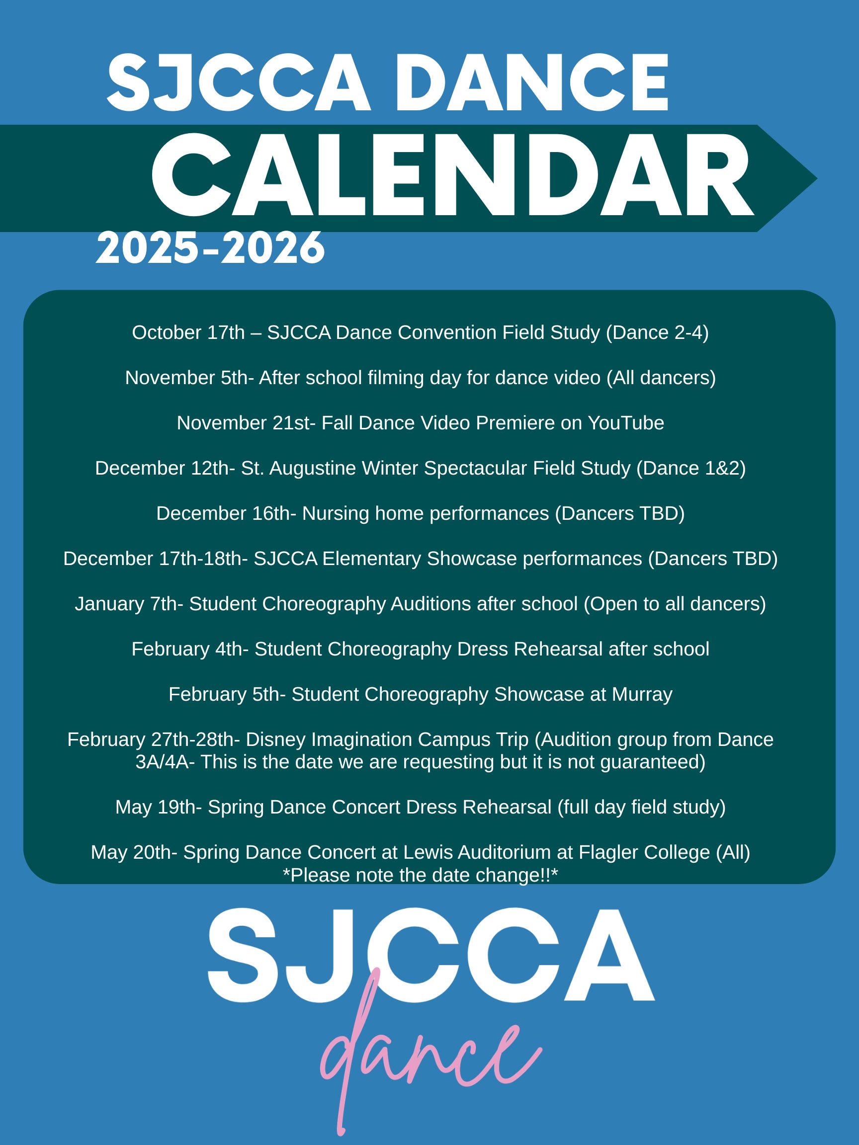 The SJCCA dance department at RJ Murray Middle School has been successful in training dancers and instilling a lifelong passion for the art form for over 20 years. Our dance instructor, Mrs. Beam, has been teaching at Murray for over 10 years and loves sharing her passion for dance with her students.
